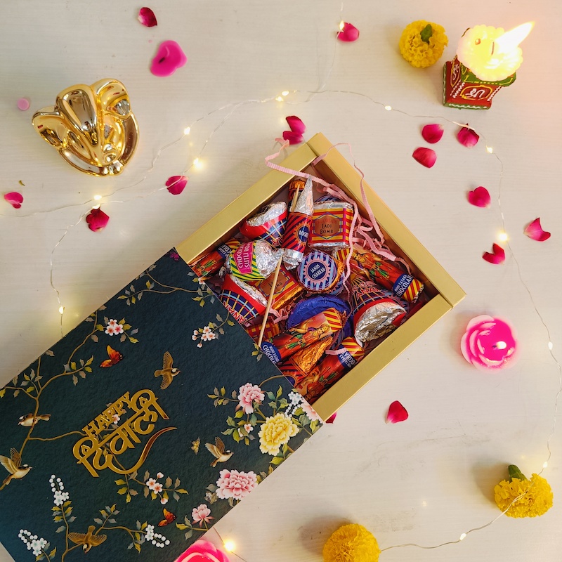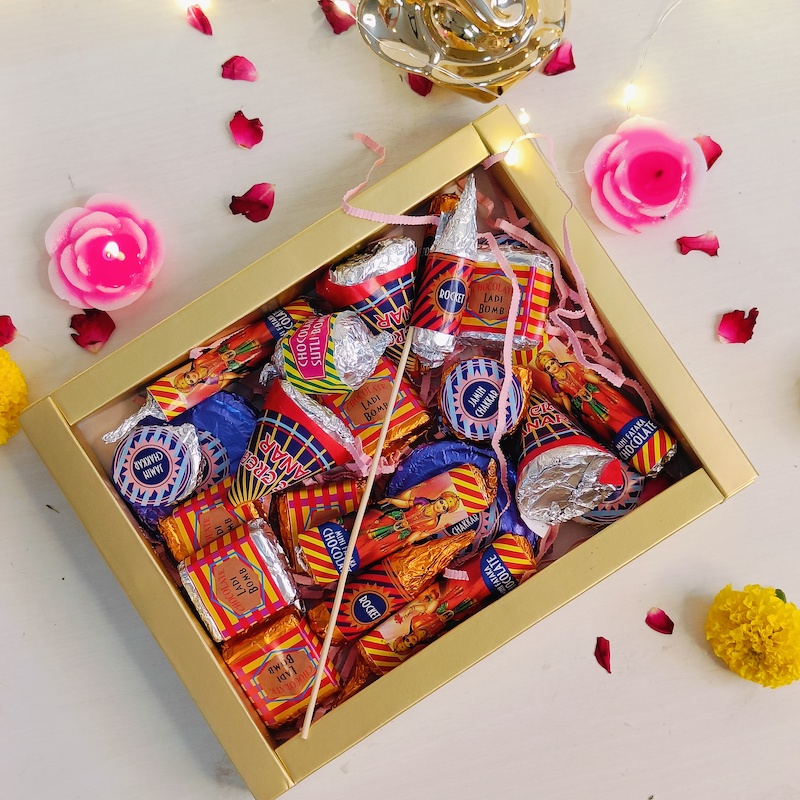 Celebrate Diwali with a grand edition of our popular chocolate crackers. This jumbo box features a larger assortment of premium chocolates shaped like classic Diwali crackers—rockets, bombs, chakris, and more—with vibrant festive wrapping. Perfect for gifting or sharing at large gatherings, it offers an indulgent and playful treat that captures the spirit of Diwali in every bite.